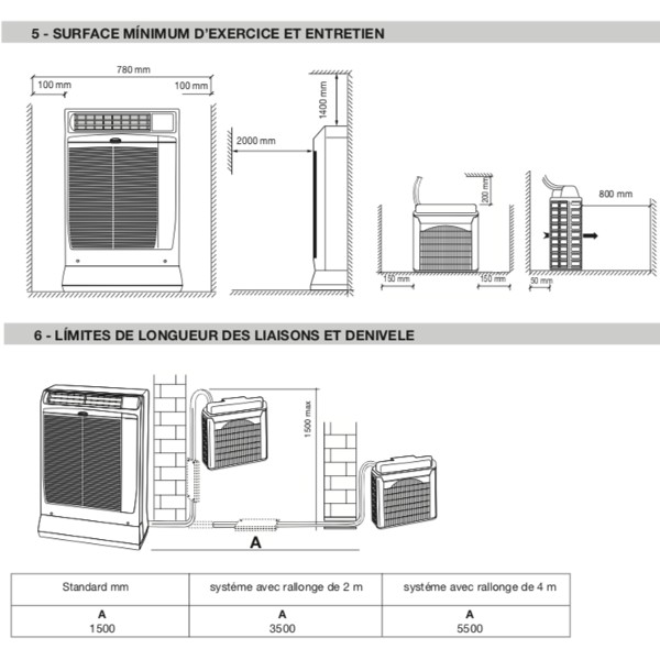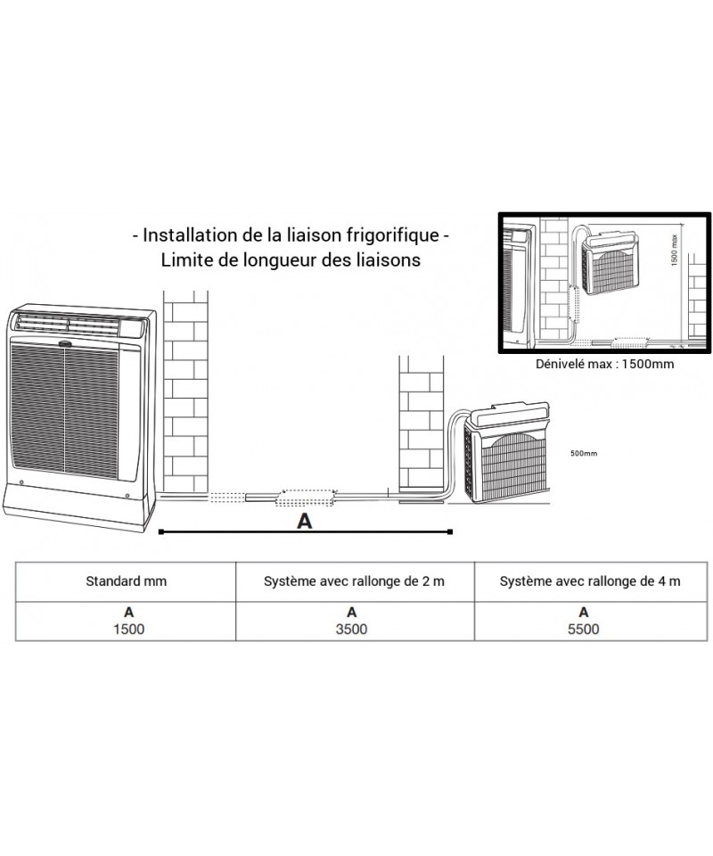 La liaison frigorifique ne doit pas dépasser une certaine longueur en fonction de l'installation. Et le dénivelé max est de 1500 mm max (voir schémas)