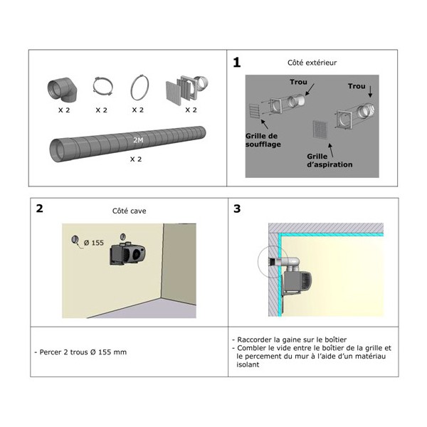 2 traversées de mur télescopiques avec volet de fermeture à ventelles.